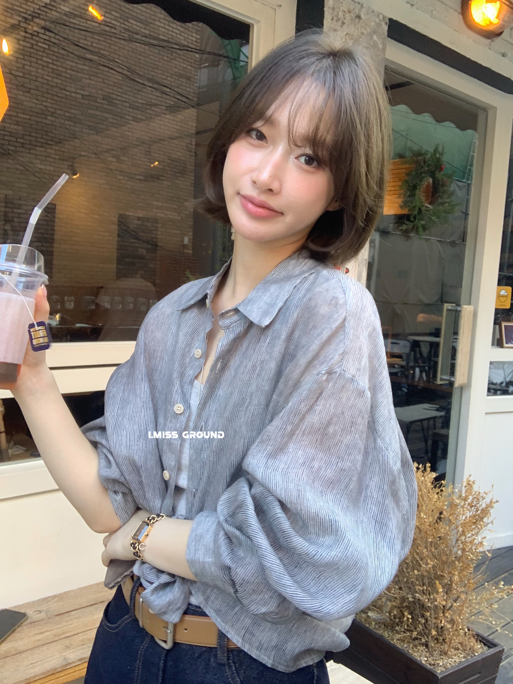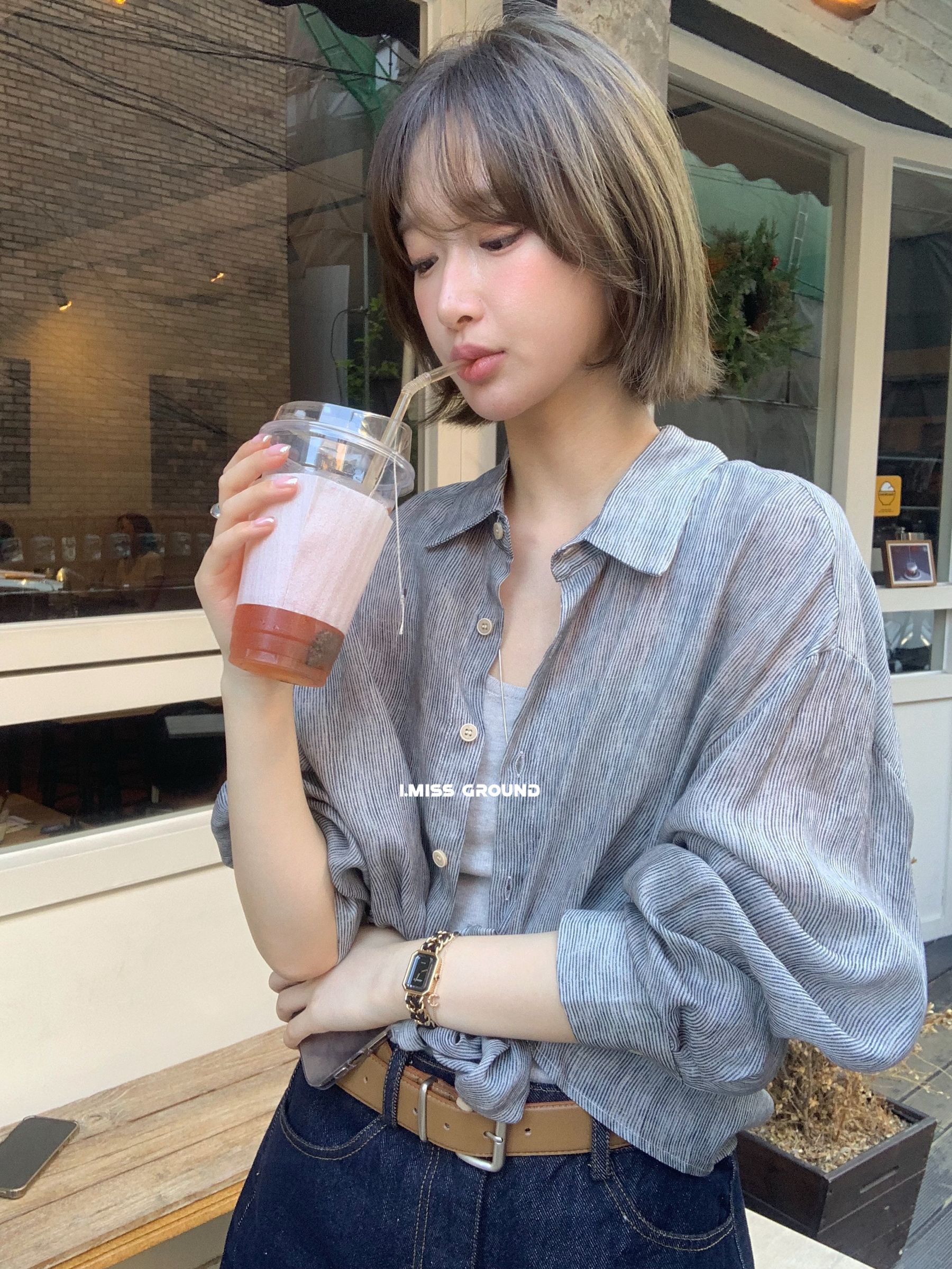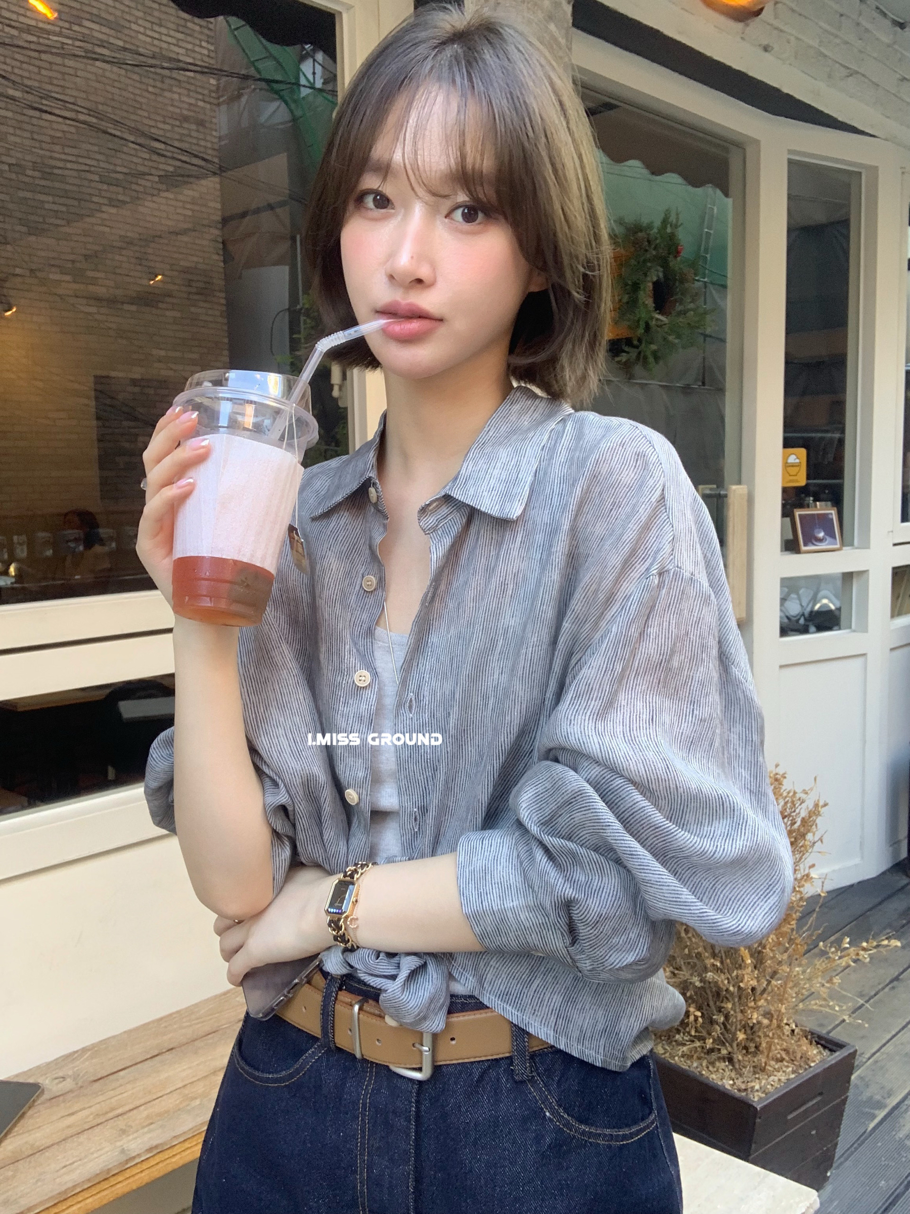 H3029# 韓國面料知性美黑條紋苧麻襯衫
