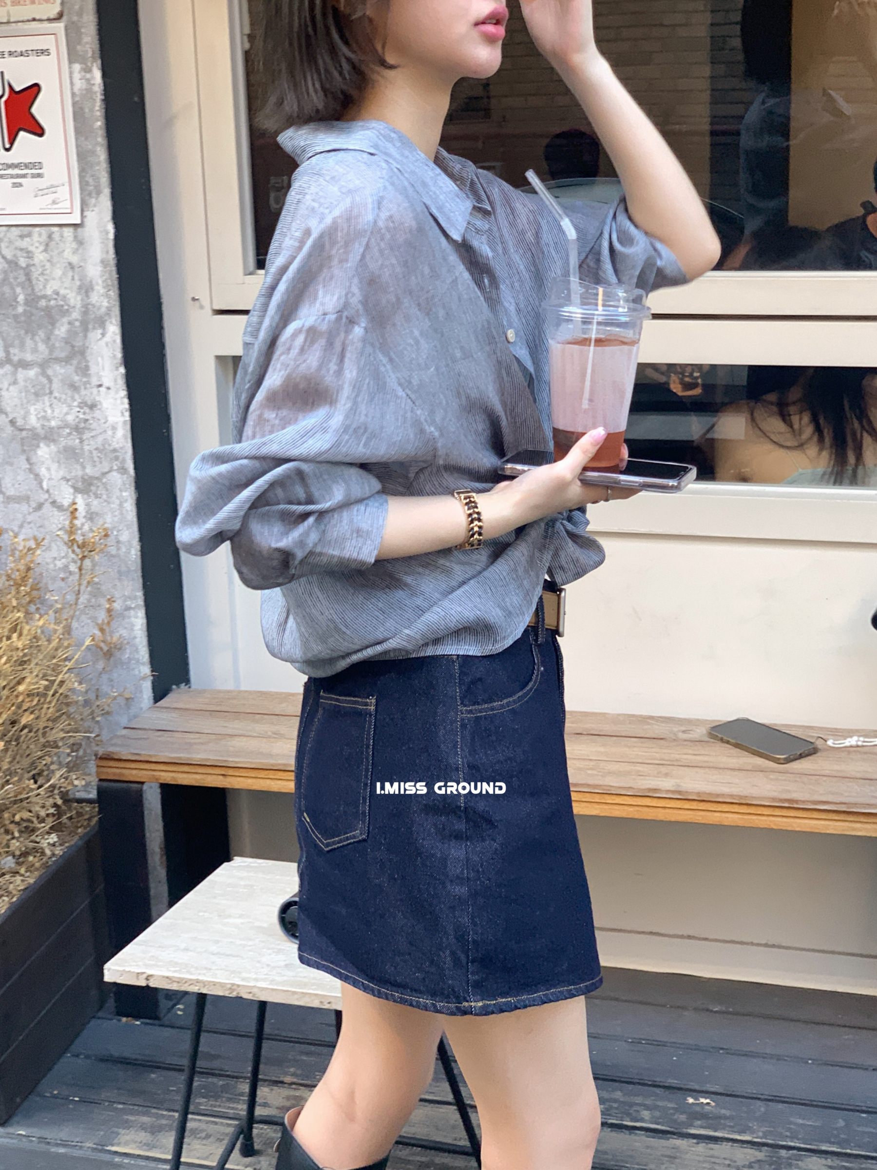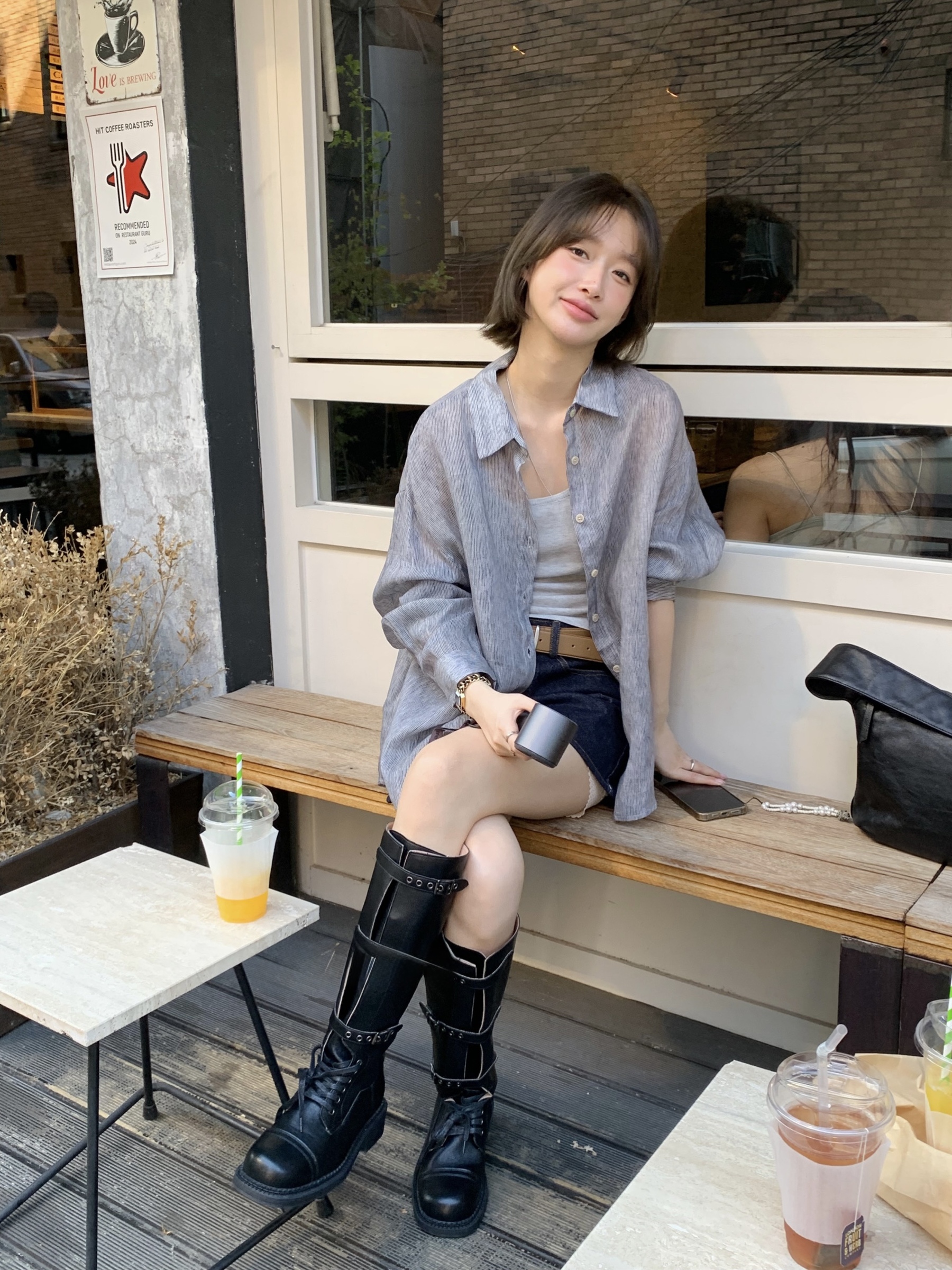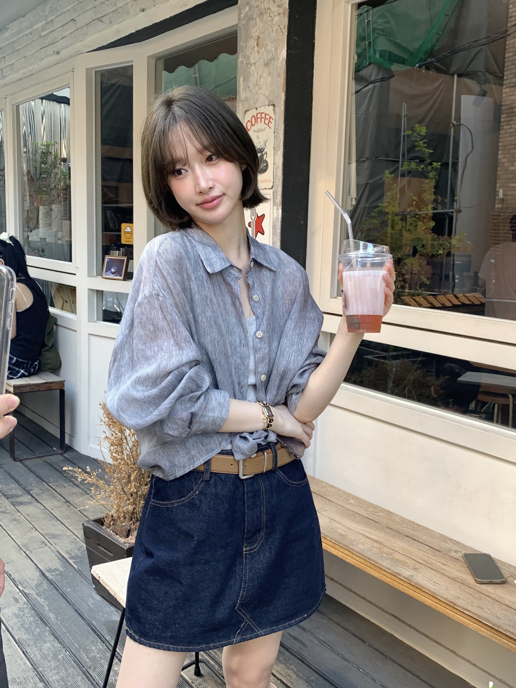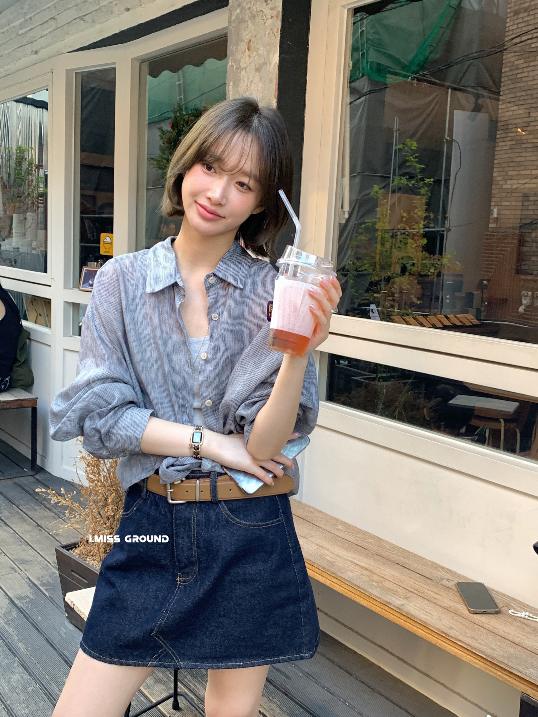 H3029# 韓國面料知性美黑條紋苧麻襯衫