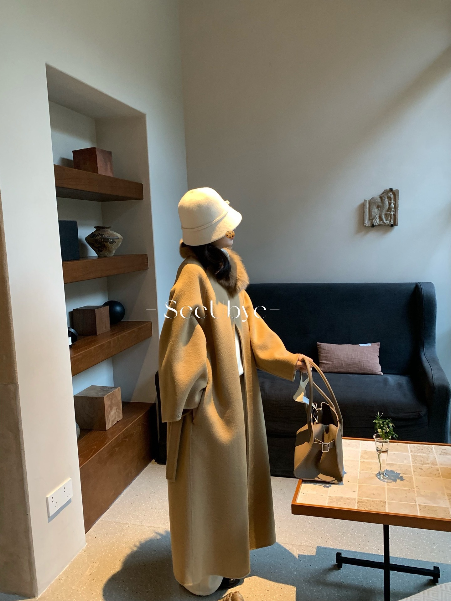 25694#帶真狐狸湘葉黃雙面手工羊毛大衣