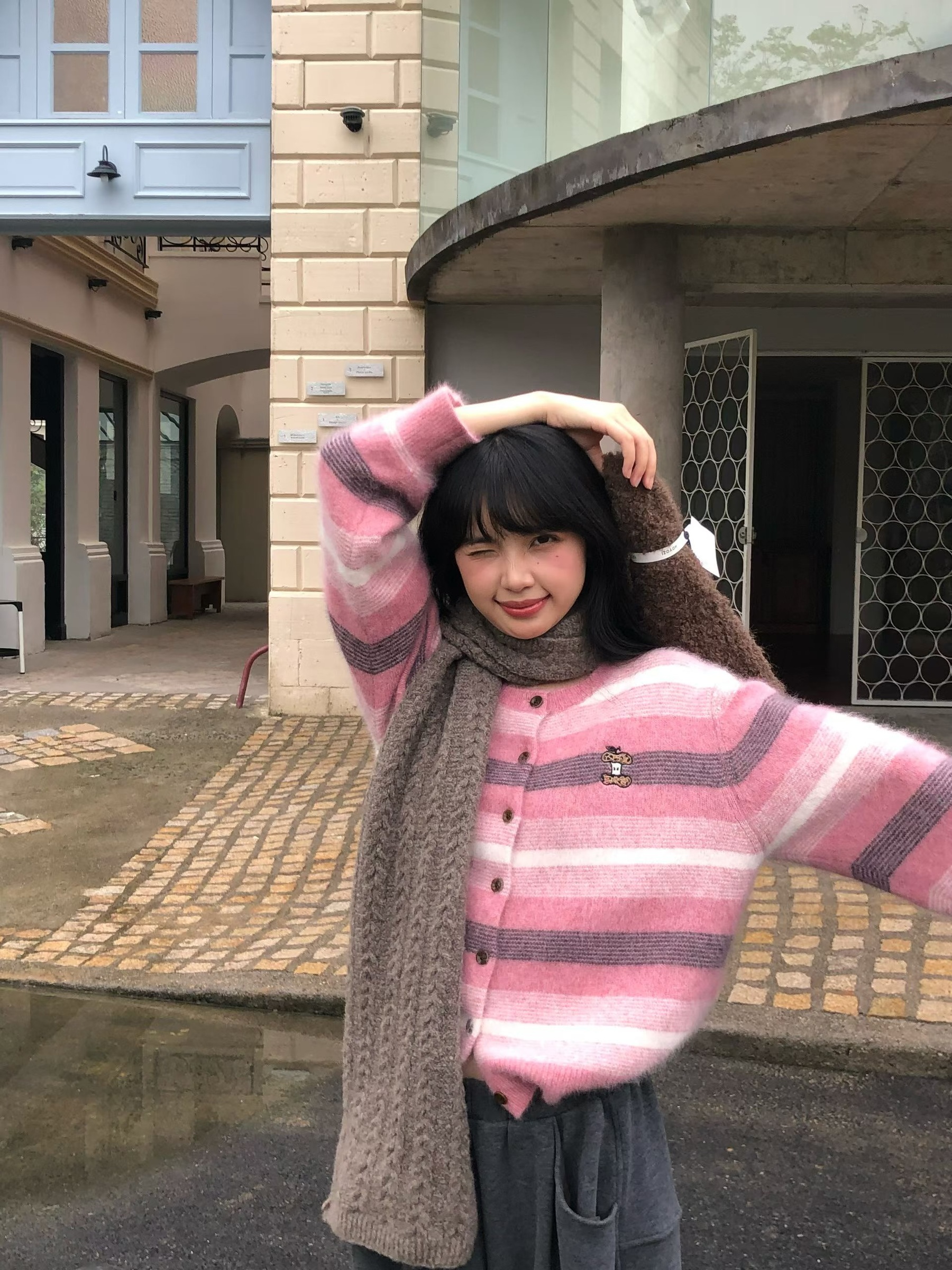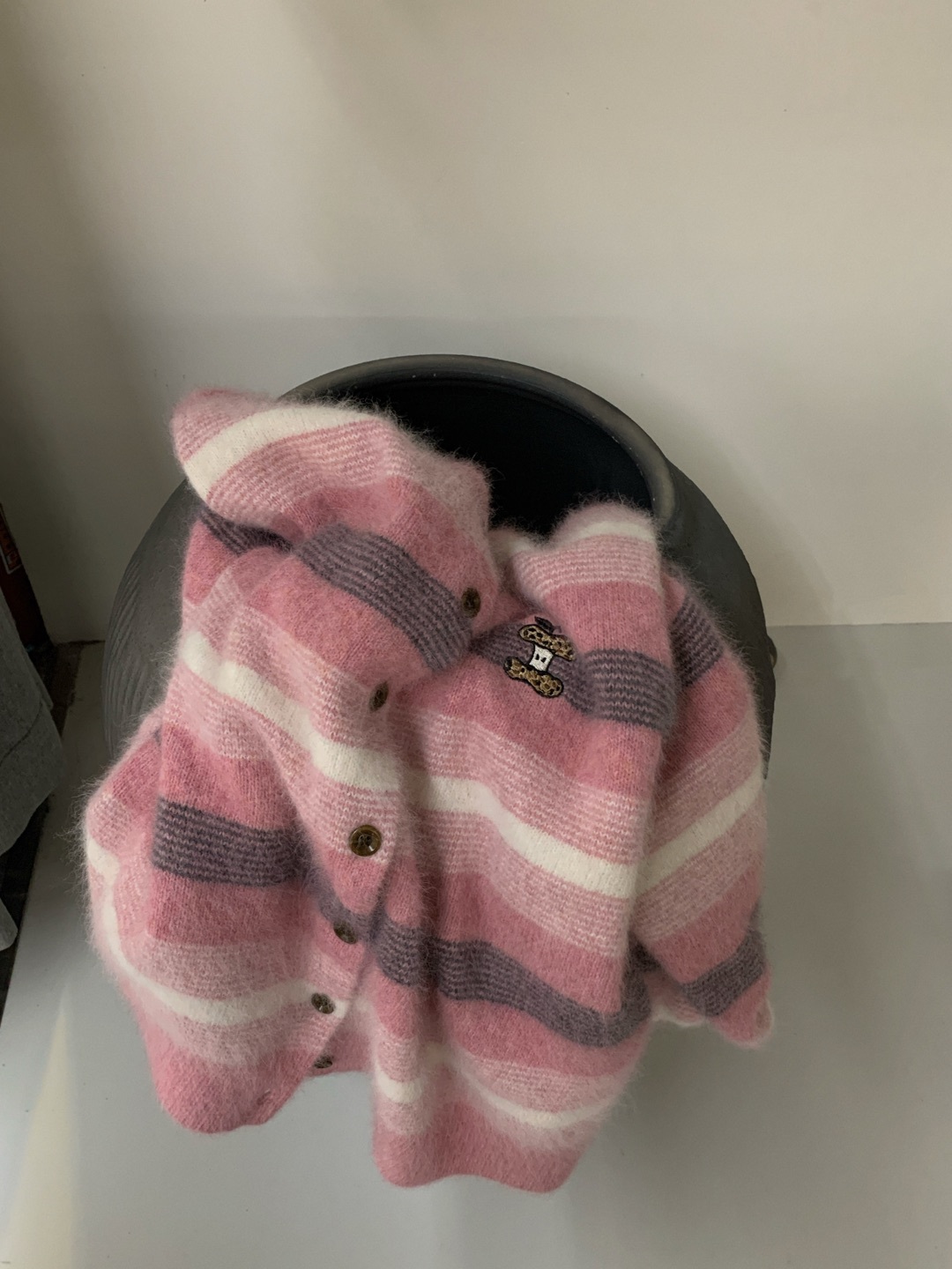A2503#正韓軟糯糯小刺繡粉條紋毛衣開衫