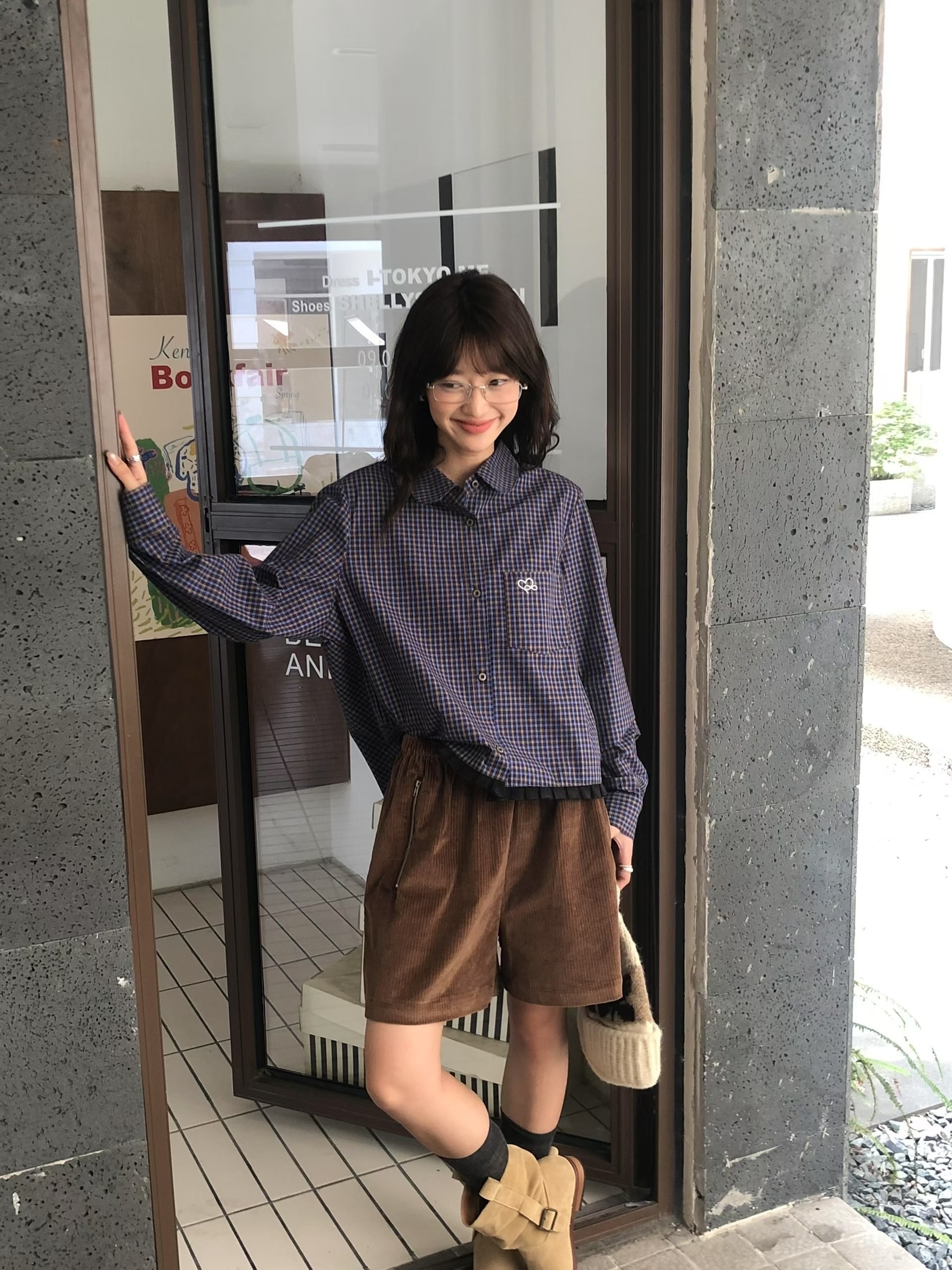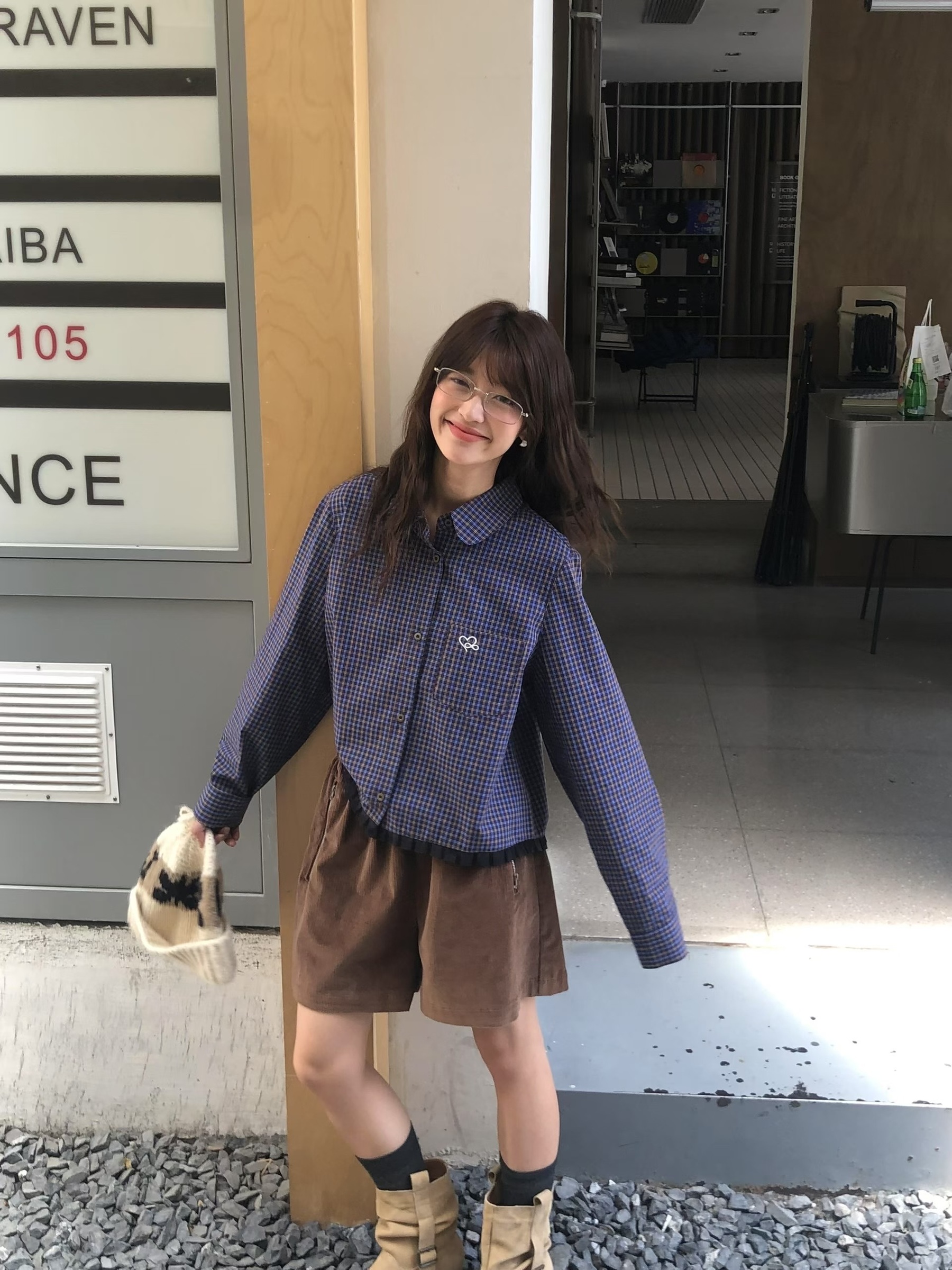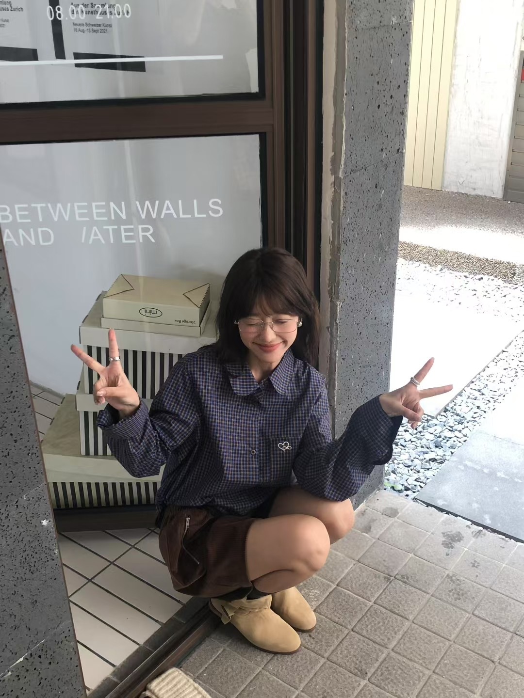 ZAW837# 正韓MiuMiu風格子刺繡蕾絲邊襯衫